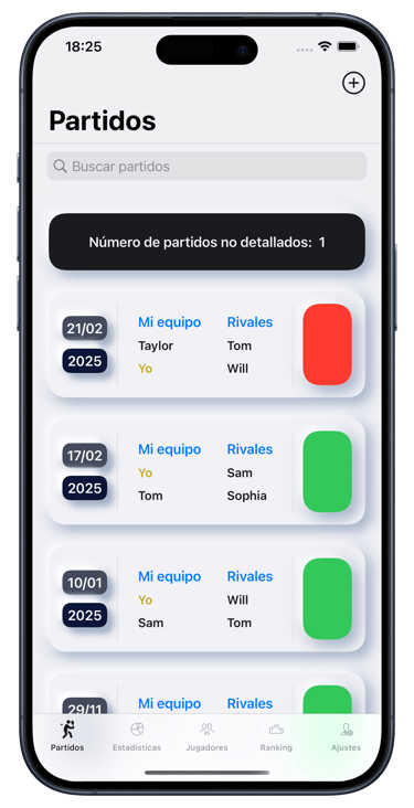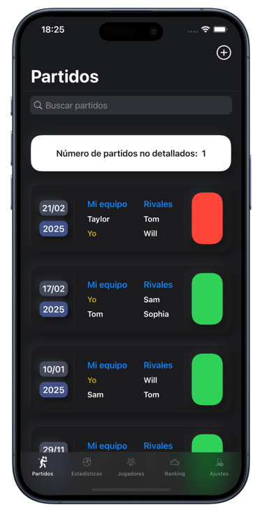 Lleva un seguimiento detallado de tus partidos. Busca partidos con tus amigos y mira quien ganó la última vez que os enfrentasteis.
